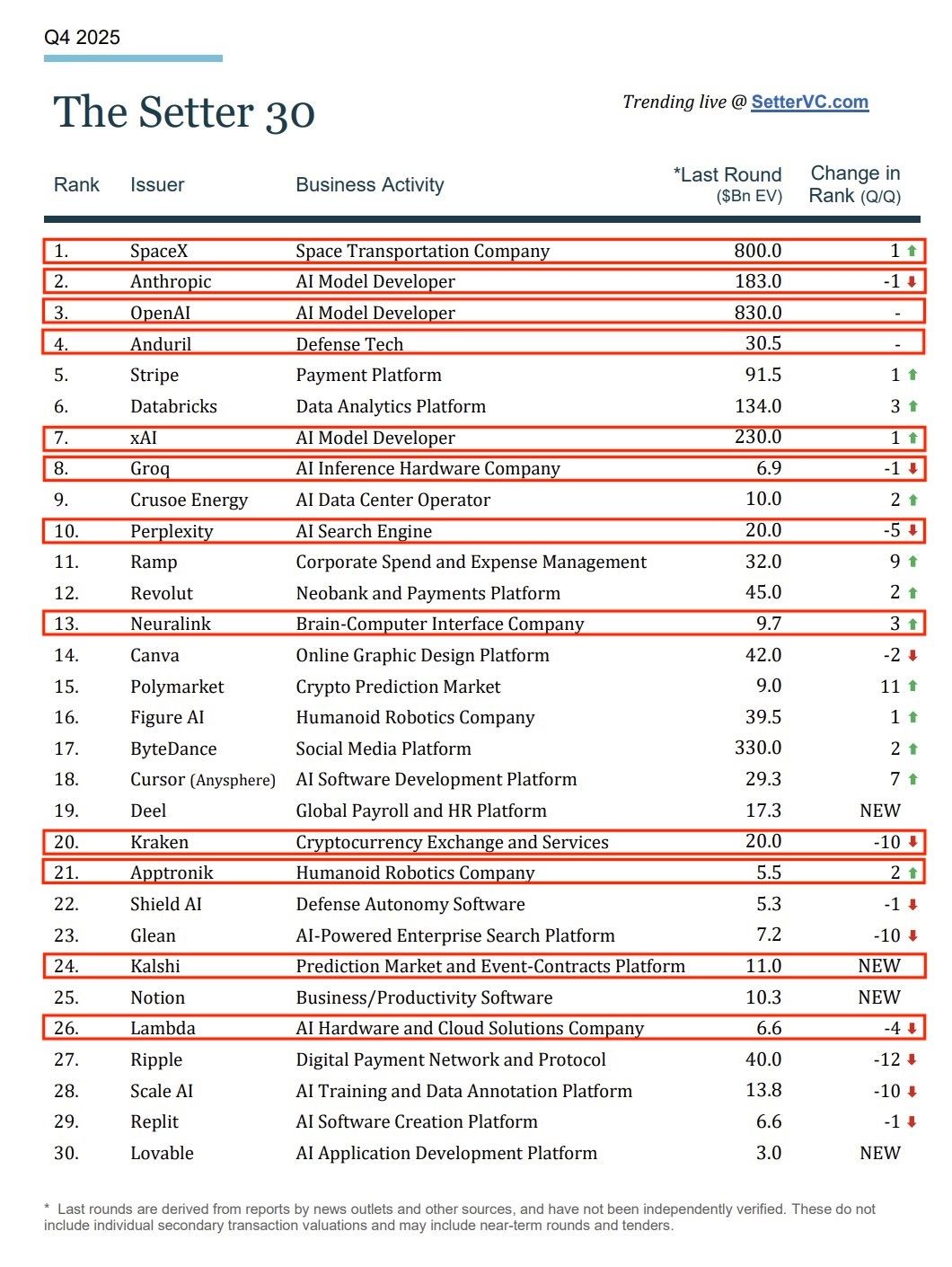 Setter just dropped a list of the most in-demand private company shares, and it’s pretty great to see how many of these names we (and many of you) already own alongside us. Almost everything near the top feels less like a bet and more like a question of timing. SpaceX, OpenAI, Anthropic, Anduril, Stripe, Databricks, xAI. These aren’t “will they win” companies, they’re “how expensive is access right now” companies. We’ll be adding to this list throughout the year and plan to share at least two deals a month with the group.